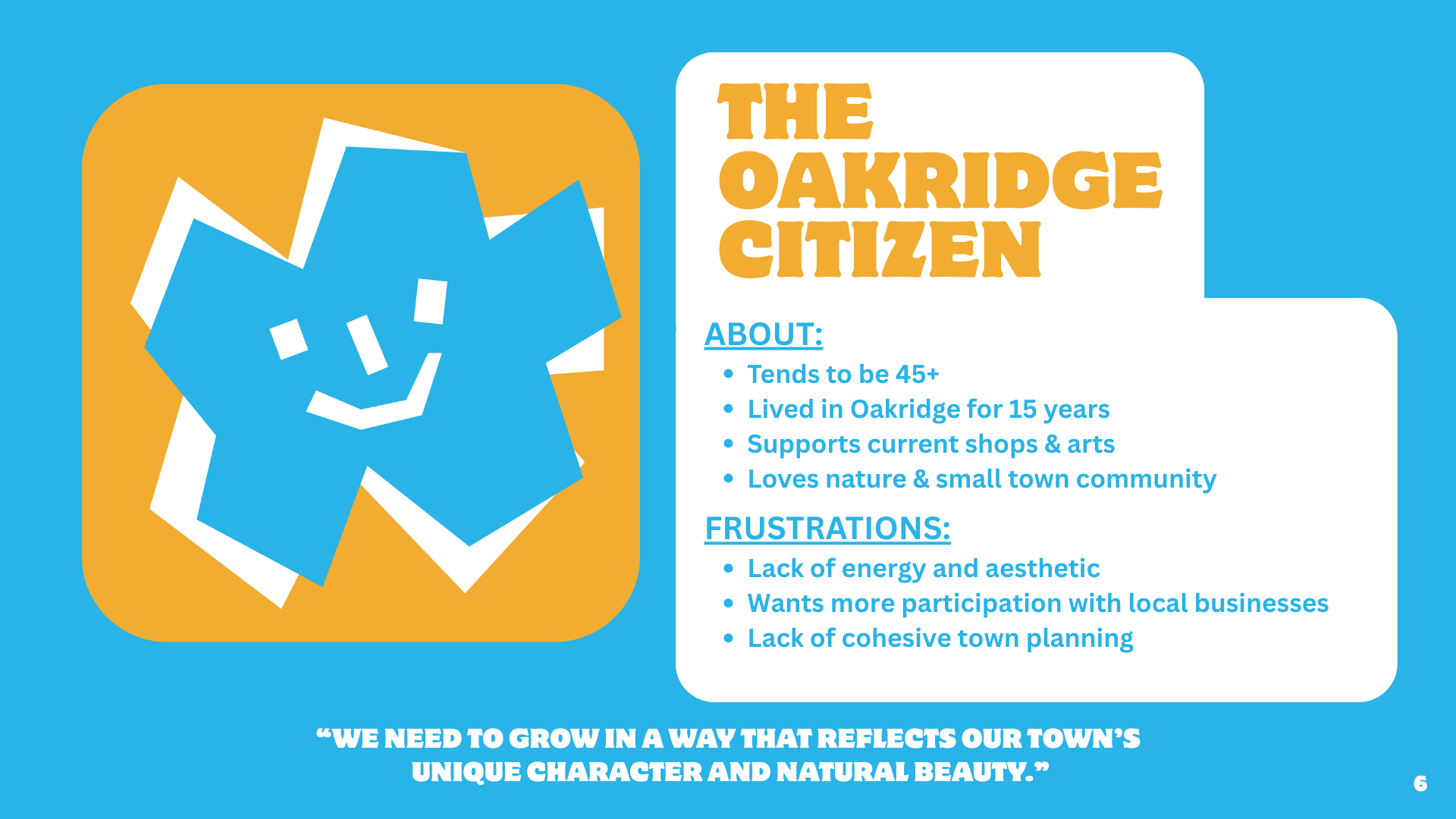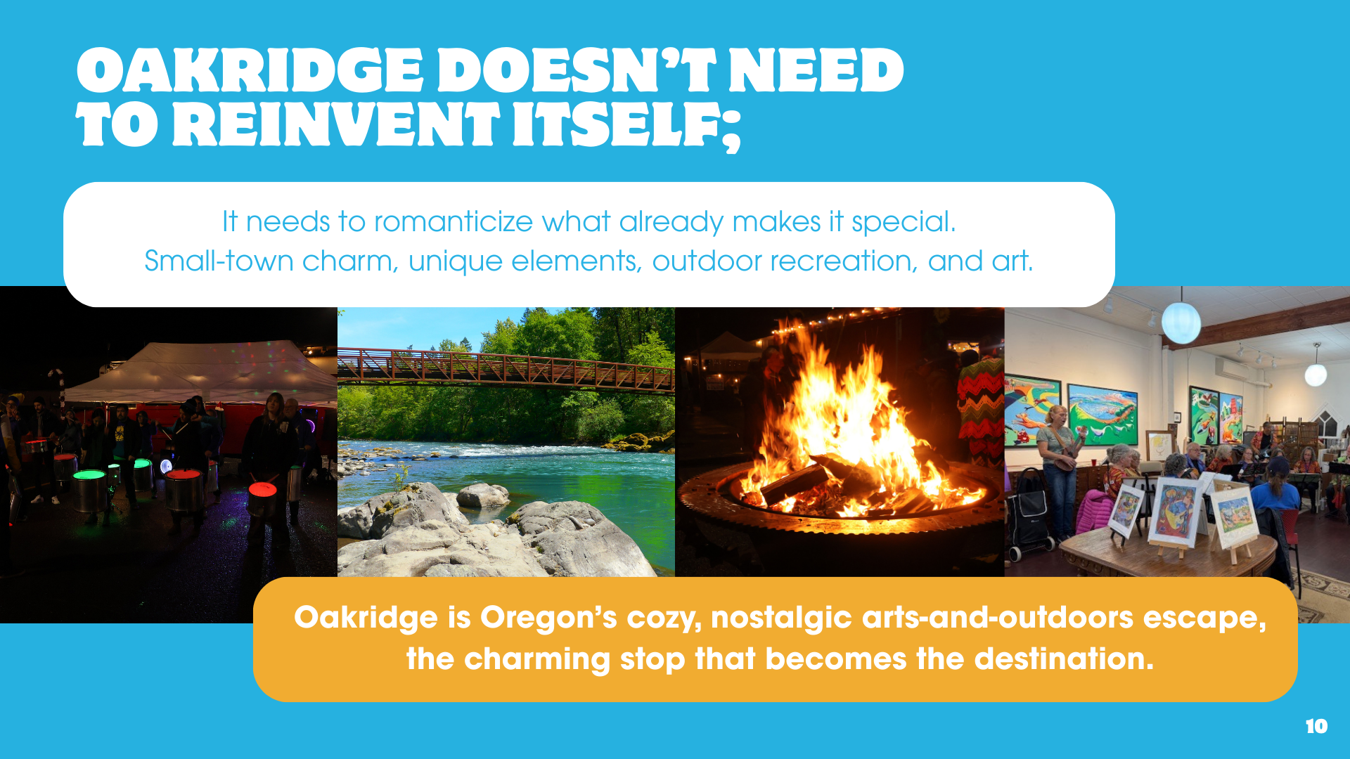 Approach: We are going to embrace the small-town charm of Oakridge. We are NOT trying to make the town something it’s not. Romanticize what it already has to offer to make it a place visitors are excited to explore. Their unapologeticness is what makes them special.