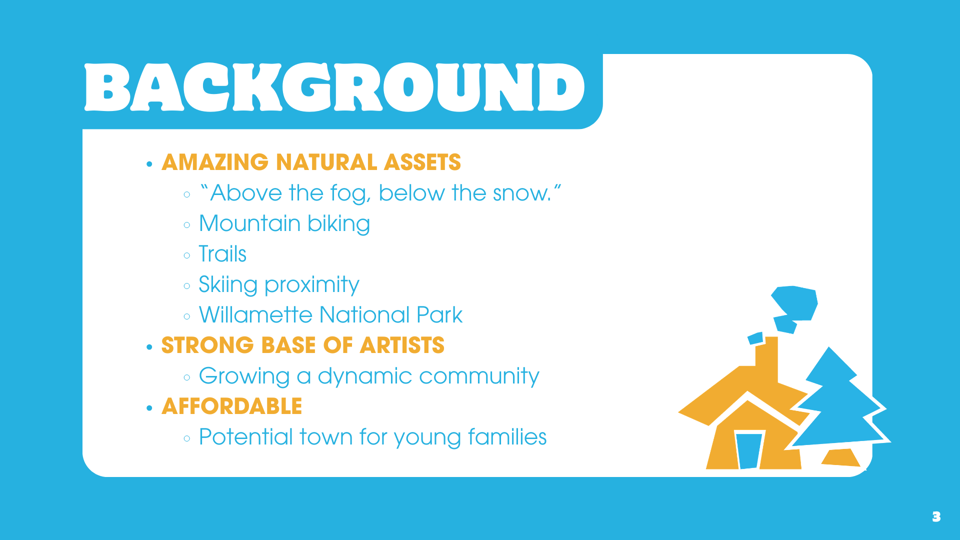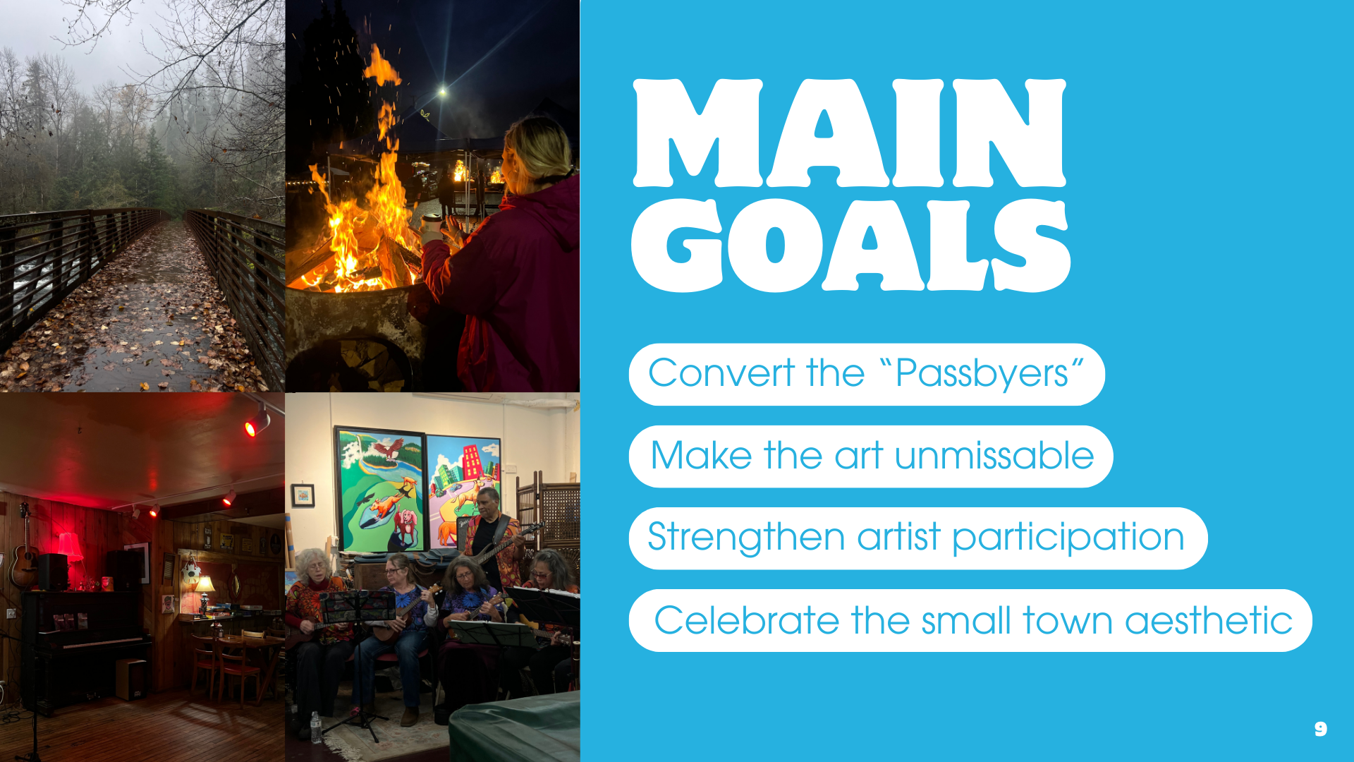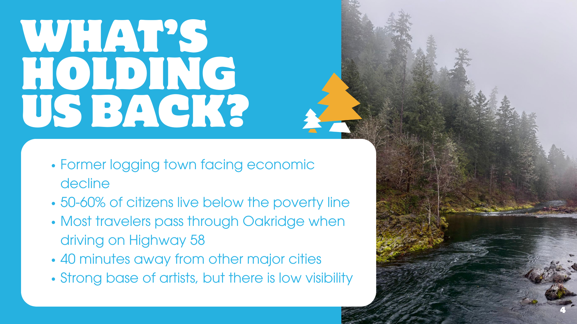 Insight: Plenty of people pass through Oakridge on their way to Willamette Pass, Crater Lake, or for a fun Mountain Biking trail, but they don’t have an incentive to stay. There is an extreme lack of awareness and excitement toward events like the artwalk and for the city as a whole.