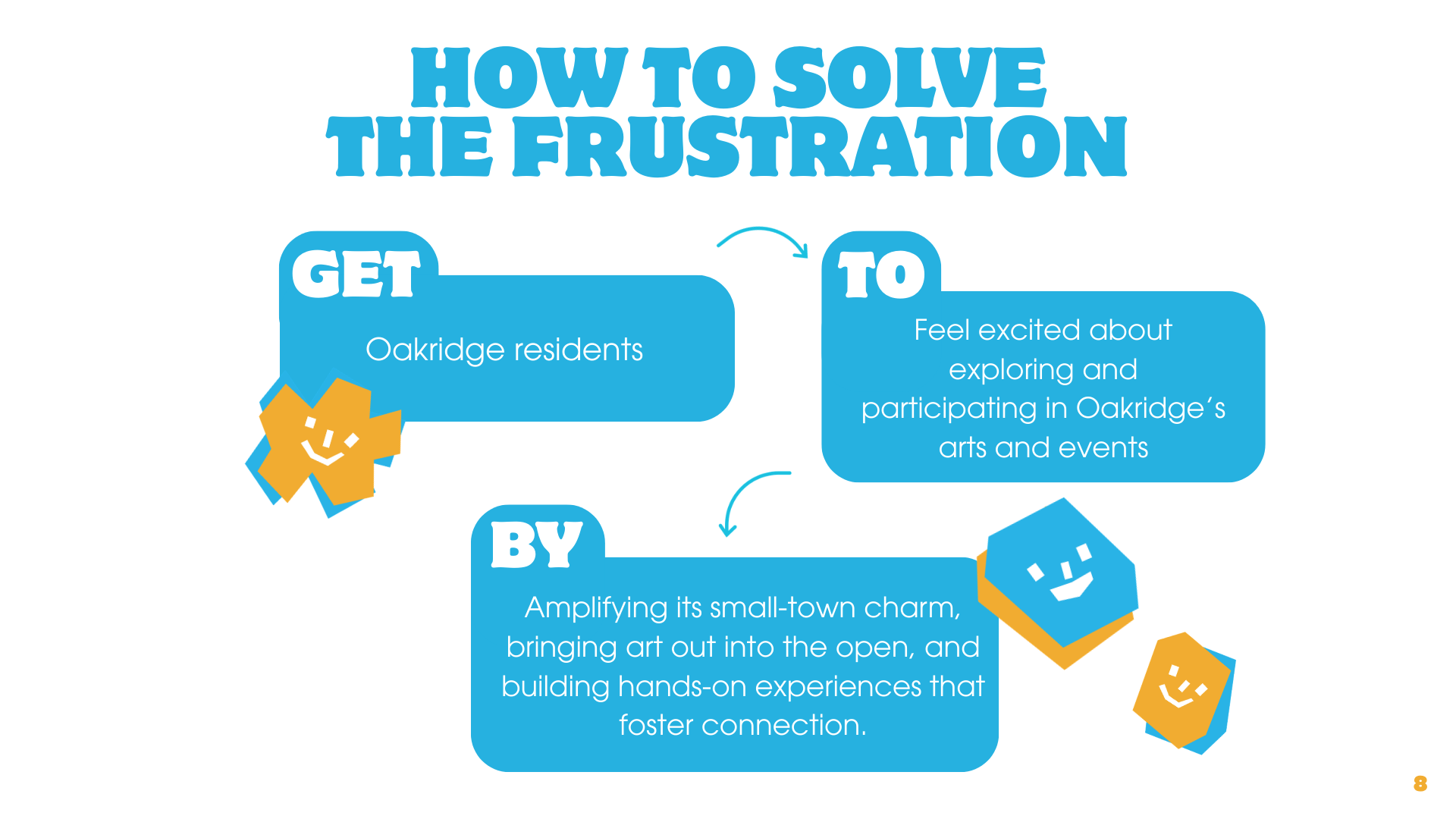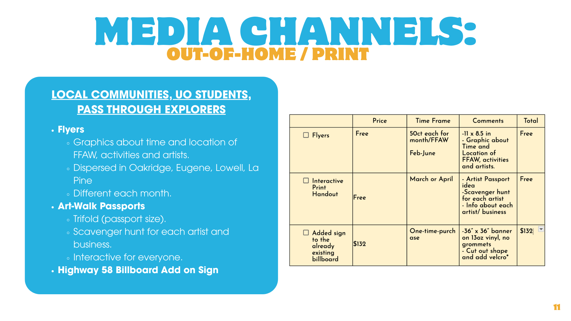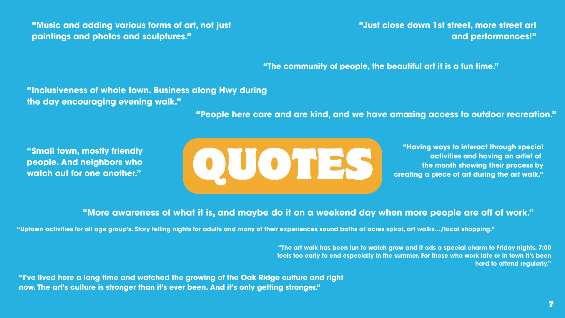 Insight: Plenty of people pass through Oakridge on their way to Willamette Pass, Crater Lake, or for a fun Mountain Biking trail, but they don’t have an incentive to stay. There is an extreme lack of awareness and excitement toward events like the artwalk and for the city as a whole.